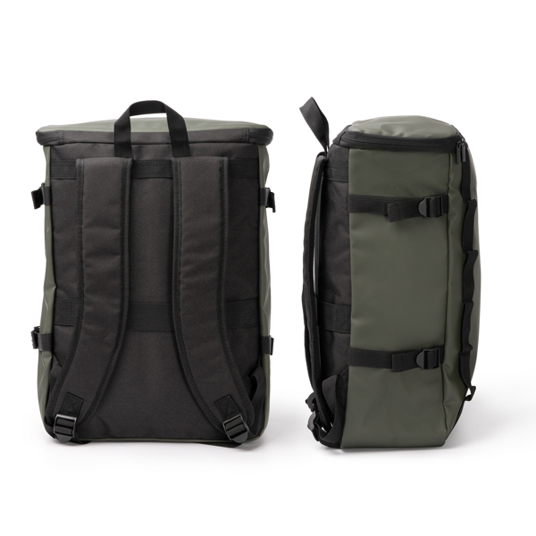 Mochila Para Entregas Virton. Mochila em couro PU e poliéster 600D com um grande compartimento principal forrado na parte superior, fecho de correr e um bolso interno com ajuste elástico para transportar um portátil até 16″. Inclui um bolso exterior invisível na frente, bem como seis pontos de fixação laterais. As correias de ajuste laterais permitem adaptar a mochila ao seu conteúdo e a correia do trolley torna-a numa opção confortável e versátil. Costas e alças de ombro acolchoadas. Medidas: [33cm/45cm/15cm]