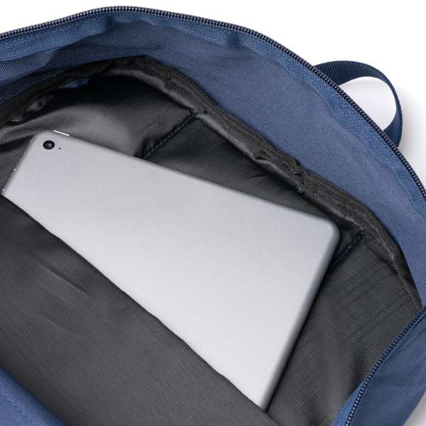 Mochila para Portátil Tinar. Mochila em RPET 600D. Dois bolsos frontais, compartimento interior com bolso almofadado para portátil de 15”. Bolso superior frontal com banda refletora e fecho de correr impermeável. Pegas e costas almofadadas. Disponível em diferentes cores. Dimensões: 26,5cm/40cm/21cm. É uma boa escolha sustentável para a sua empresa.