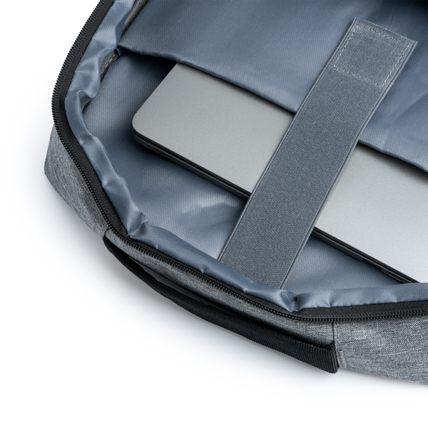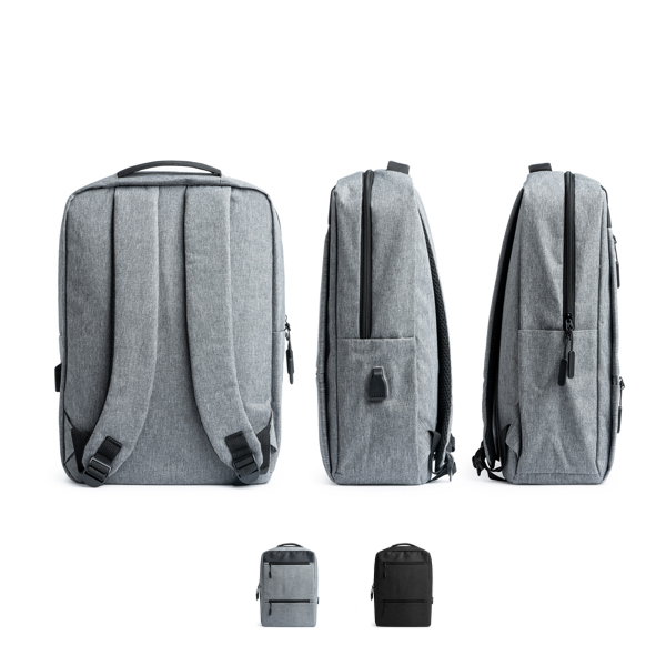 Mochila RPET 300D Narvik. Mochila em poliéster 300D. Design inovador com acabamento OXFORD. Bolso principal acolchoado, ideal para portátil, com dois bolsos frontais com fechos elegantes. Entrada USB integrada incluída para ligar a carregador portátil (não incluído). Alças para os ombros e costas acolchoadas. Medidas: [31cm/43cm/16cm]